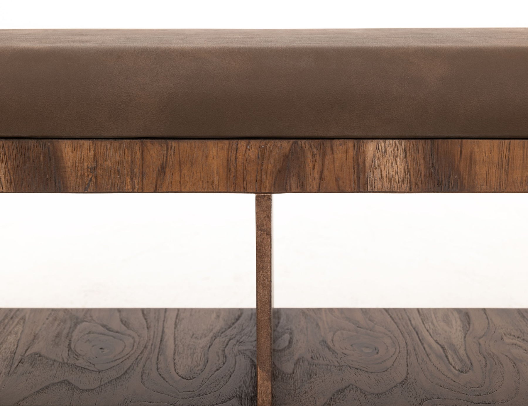 Upholstered Seat Bench with Two Open Shelves. The Balam bench is a beautifully crafted piece made from sustainable mango and engineered teak wood. Its elegant design blends organic warmth with modern sophistication, making it a perfect addition to any space. The bench features a comfortable cushioned seat with gently rounded corners and an open storage compartment for books, blankets, or decorative items. Ideal for an entryway, bedroom or reading nook, the Balam bench adds effortless charm to any setting.