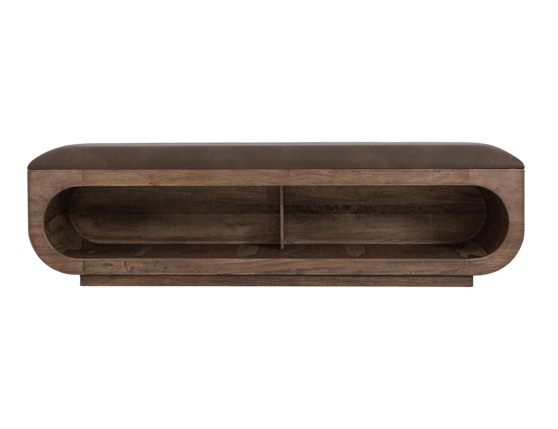 The bench features a comfortable brown cushioned seat with gently rounded corners and an open storage compartment for books, blankets, or decorative items. Ideal for an entryway, bedroom, or reading nook, the Balam bench adds effortless charm to any setting.