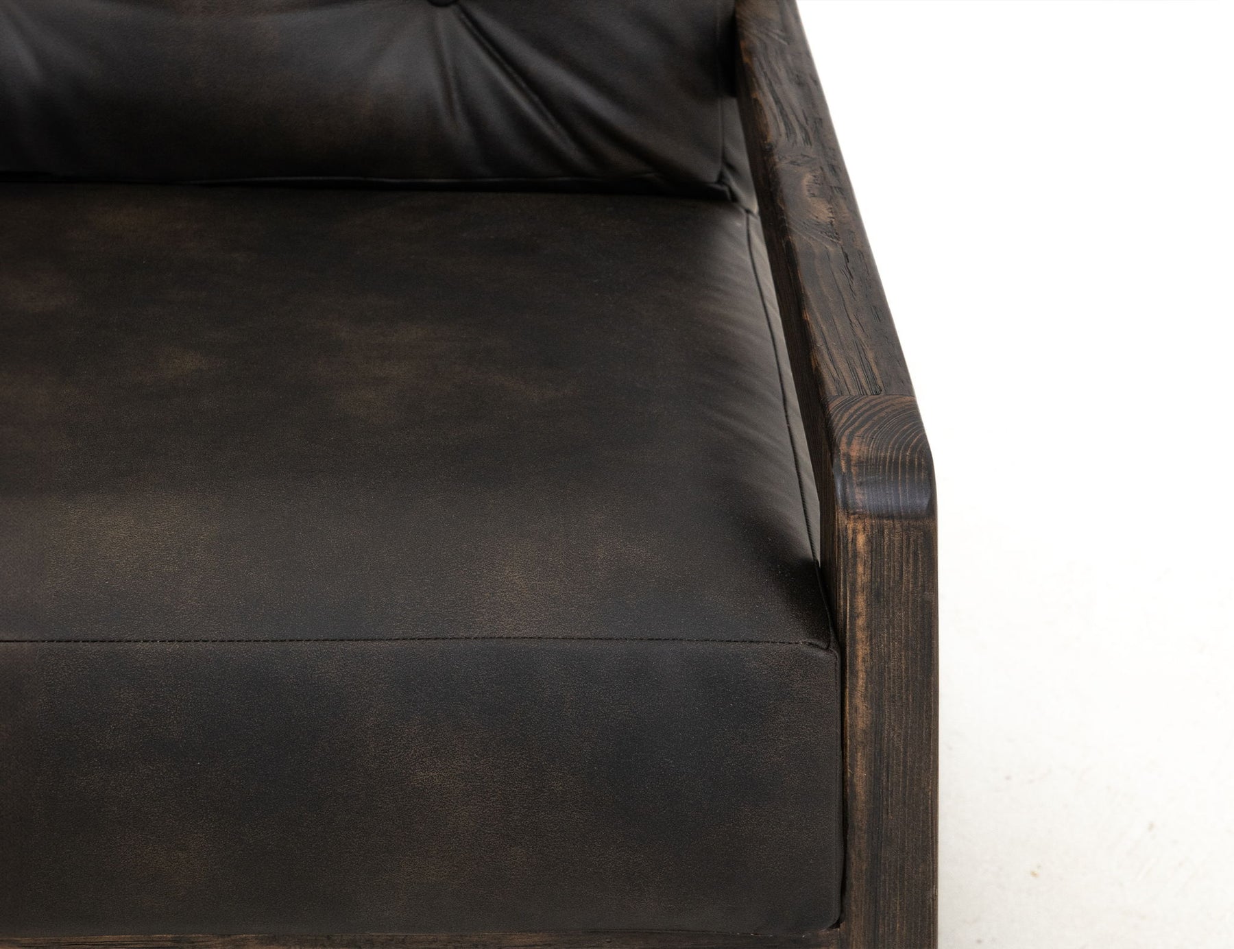 Wooden Frame, Upholstered Armchair. The Balam armchair features a wooden frame with a dark finish, offering a blend of modern style and timeless charm. The seat and backrest are upholstered in black faux leather, accented with elegant button tufting for added sophistication. With its thick cushioning and sturdy structure, this armchair combines comfort and durability. Its refined design is perfect for lounging in style.