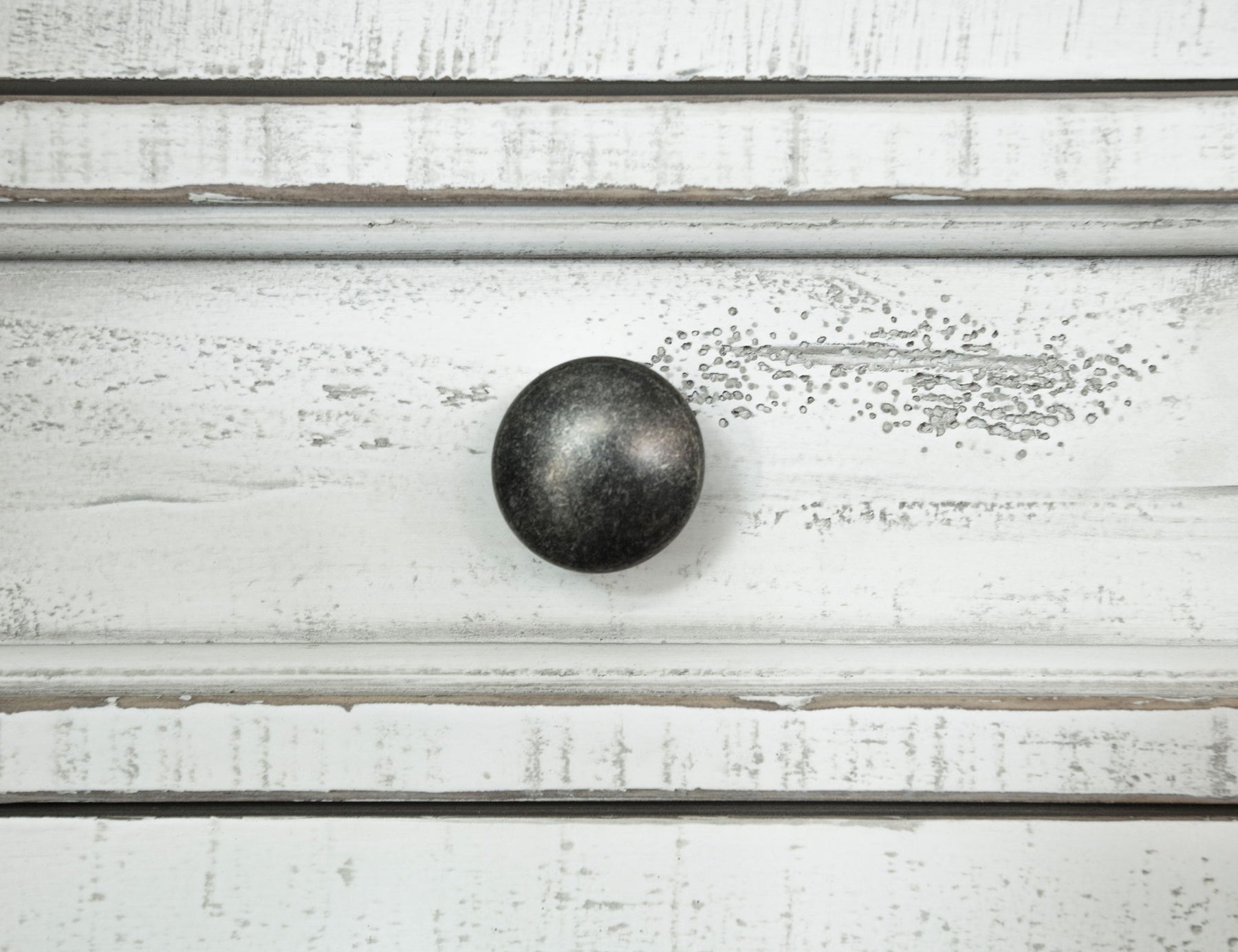 - Two-tone finish features a hand-rubbed off-white finish and warm gray stain on top