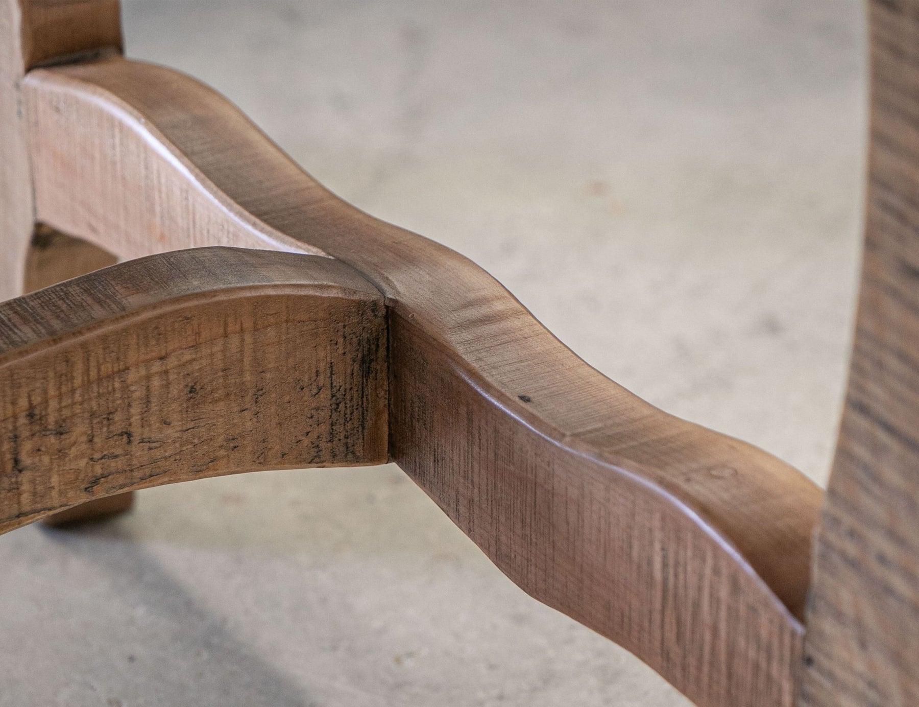 - Finish is achieved through a multi-step process in which pine is lightly distressed, and hand-applied two-tone lacquer in hues of light brown is used.