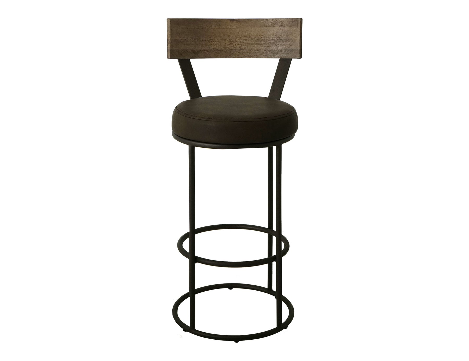 Upholstered Seat & Metal Frame Barstool, 30". The Xel-Ha collection stool beautifully combines industrial and rustic design elements. It has a sturdy metal frame with a circular base and footrest supports, providing stability and durability. The seat is round and cushioned for comfort, while the backrest features an eye-catching wooden panel, adding warmth and character to the overall design. This versatile stool is ideal for modern, industrial, or eclectic spaces, seamlessly blending style and functionality.