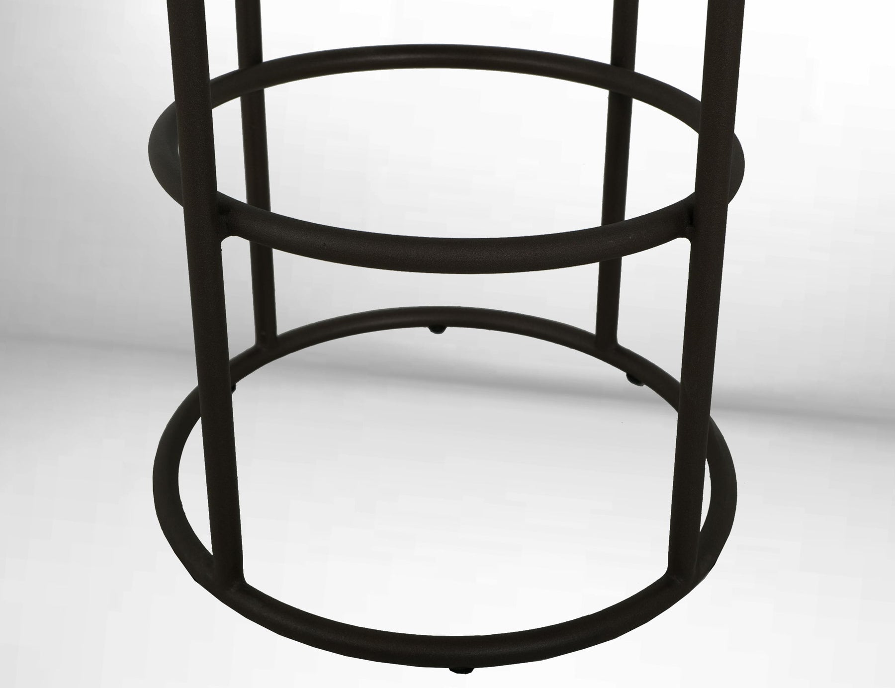 Upholstered Seat & Metal Frame Barstool, 24". The Xel-Ha collection stool beautifully combines industrial and rustic design elements. It has a sturdy metal frame with a circular base and footrest supports, providing stability and durability. The seat is round and cushioned for comfort, while the backrest features an eye-catching wooden panel, adding warmth and character to the overall design. This versatile stool is ideal for modern, industrial, or eclectic spaces, seamlessly blending style and functionality.