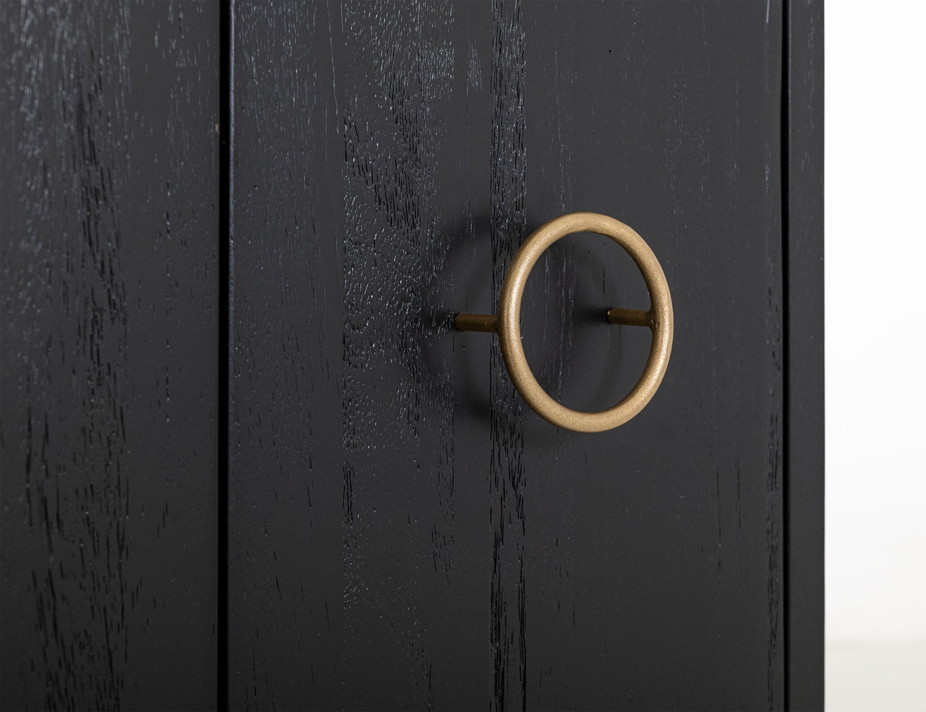 4 Door, Console. The Ebano Console, features a breathtaking top made from natural stone, ethically sourced from a quarry. This stunning piece brings an air of elegant sophistication to any room. Its metal base provides reliable support and creates a striking contrast with the stone's organic texture. The custom metal pulls adorn the doors in a luxurious golden finish, enhancing the captivating black-and-gold contrast. The sleek black finish of the Ebano Console reflects a modern deco design and makes it a truly eye-catching addition to your decor. Using multiple species of wood in its construction showcases different grains, adding uniqueness. Transform your living area with this inspiring black furniture console that seamlessly combines functionality with aesthetic appeal.