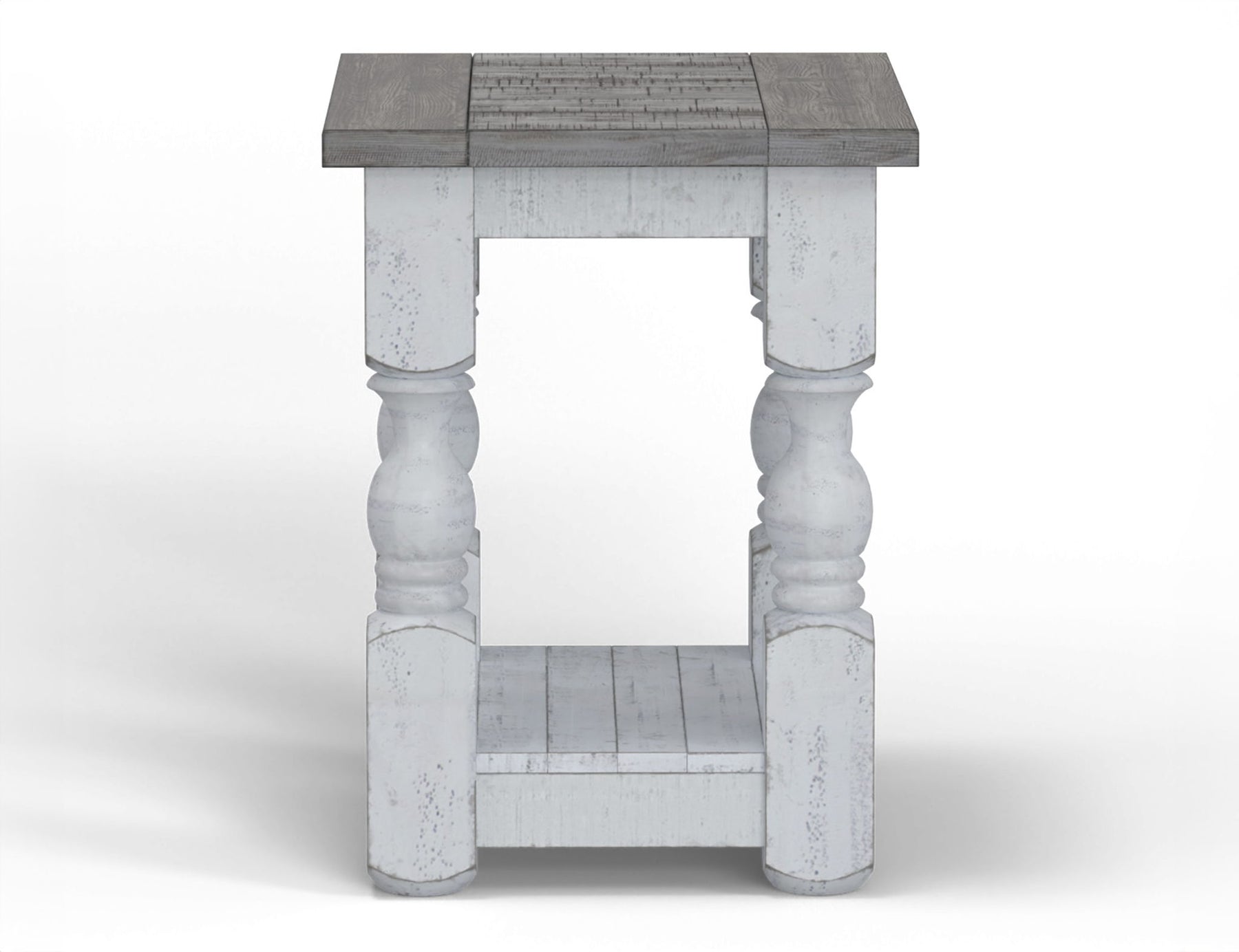 Chairside Table. Exuding farmhouse chic with just the right touch of old-world charm, the Stone Collection is meticulously crafted from solid pine wood. The wood is lightly distressed, showcasing a white finish and complemented by weathered gray tops.