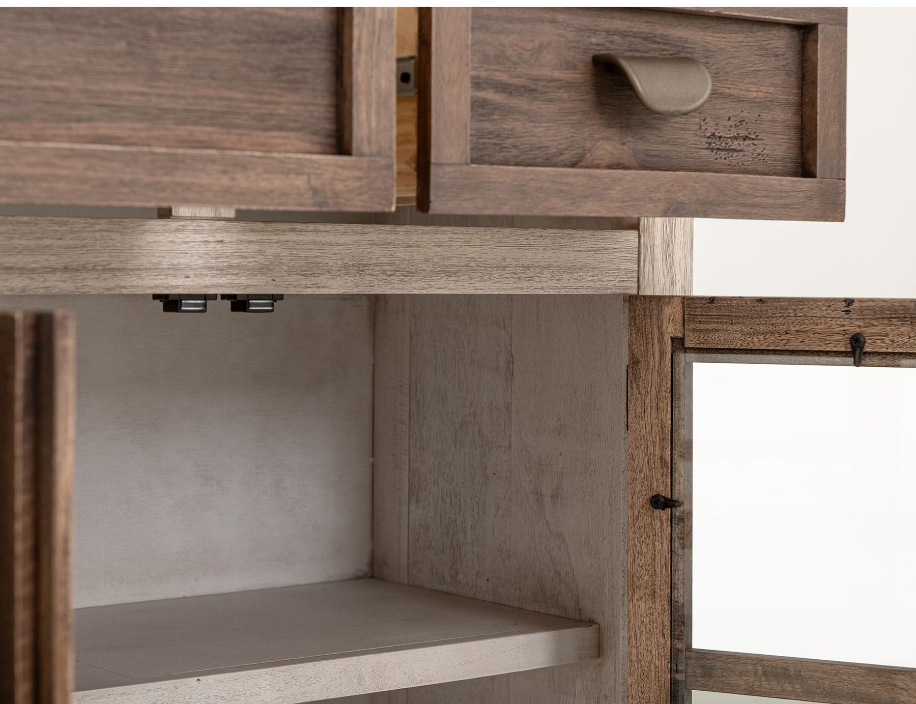3 Drawer 4 Glass Door Console. Introducing Sahara, an organic modern collection designed to transform your space into a tranquil and neutral haven. Crafted from sustainably sourced, lightly distressed mango wood, this stunning minimalistic collection effortlessly blends style and sustainability, making it a perfect fit for any space.
