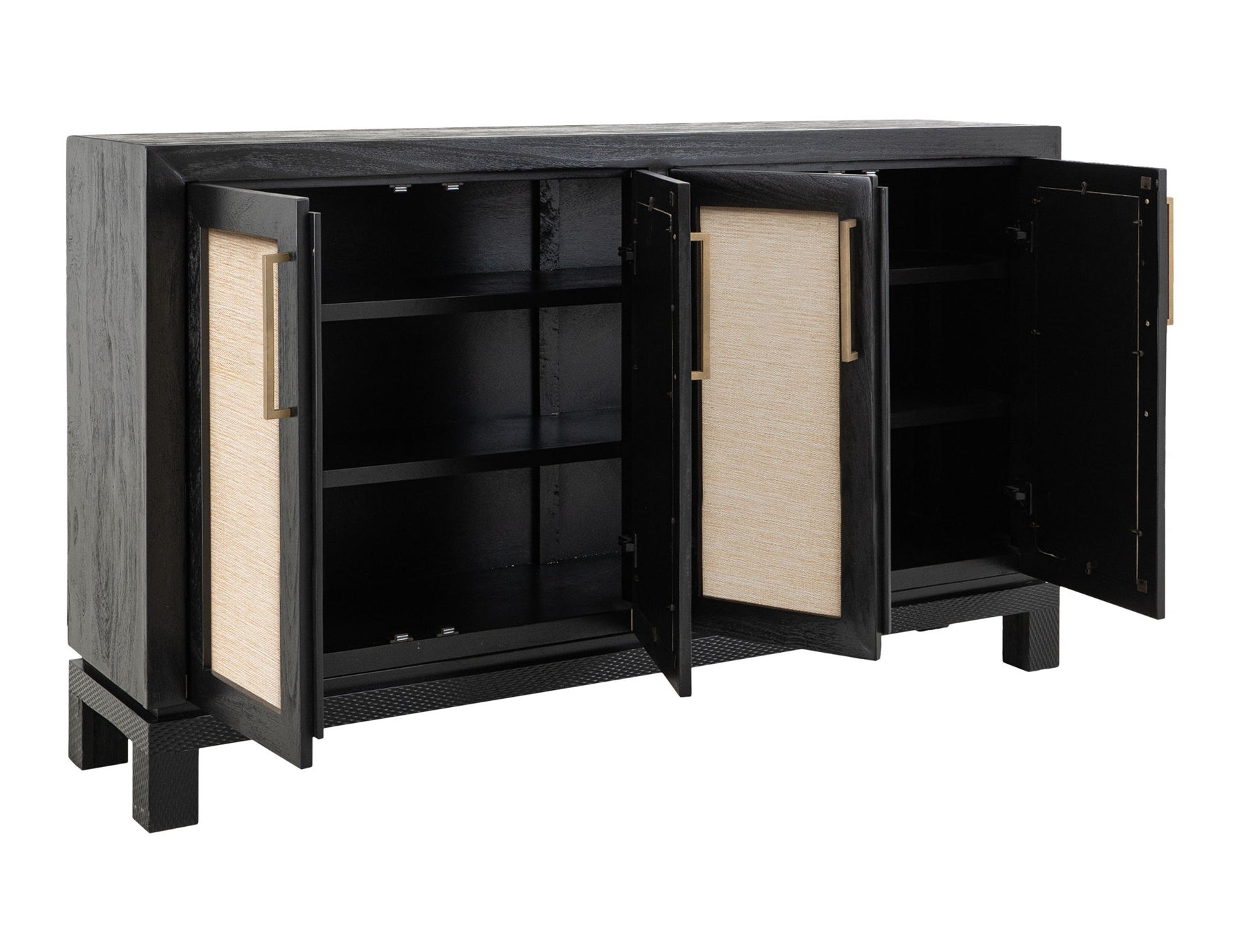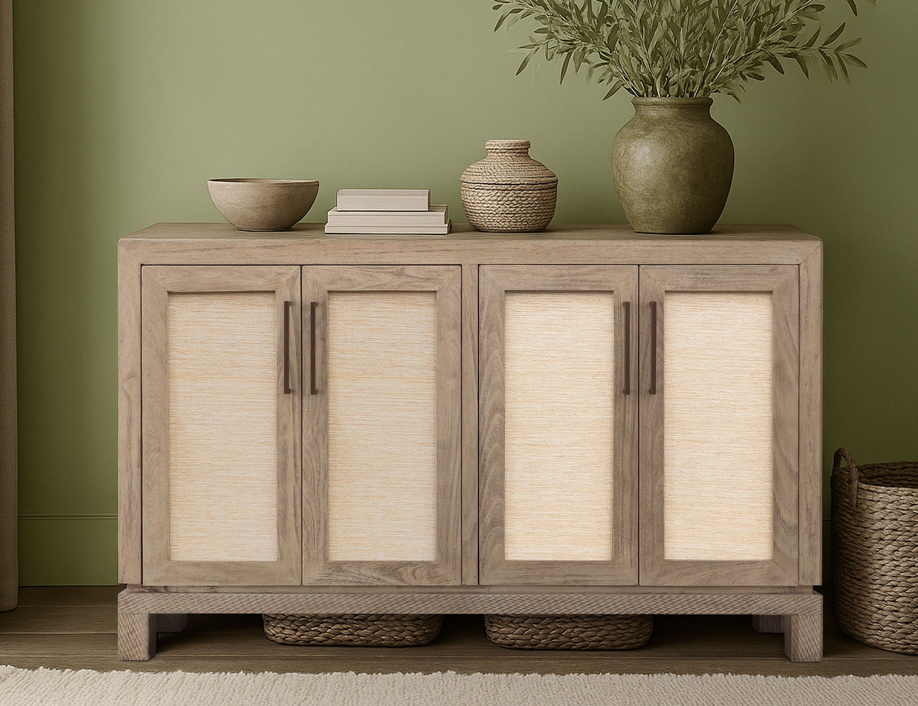 4 Door, Console. Bring warmth and character to your home with the Solara Console, expertly handcrafted from solid Melina wood and finished in a lacquer. The door panels are adorned with woven yucca fiber, and the base features CNC-machine textured, providing a touch of organic charm and elegance. It features two shelves for practical storage and custom metal pulls; the Solara seamlessly combines artistic details with functional design, crafted to be cherished for a lifetime.