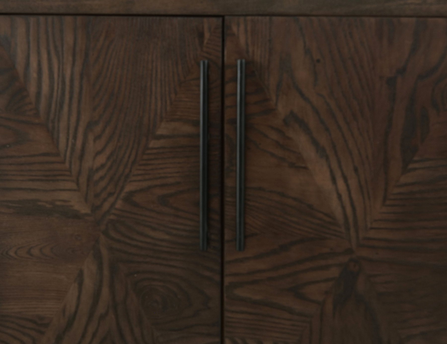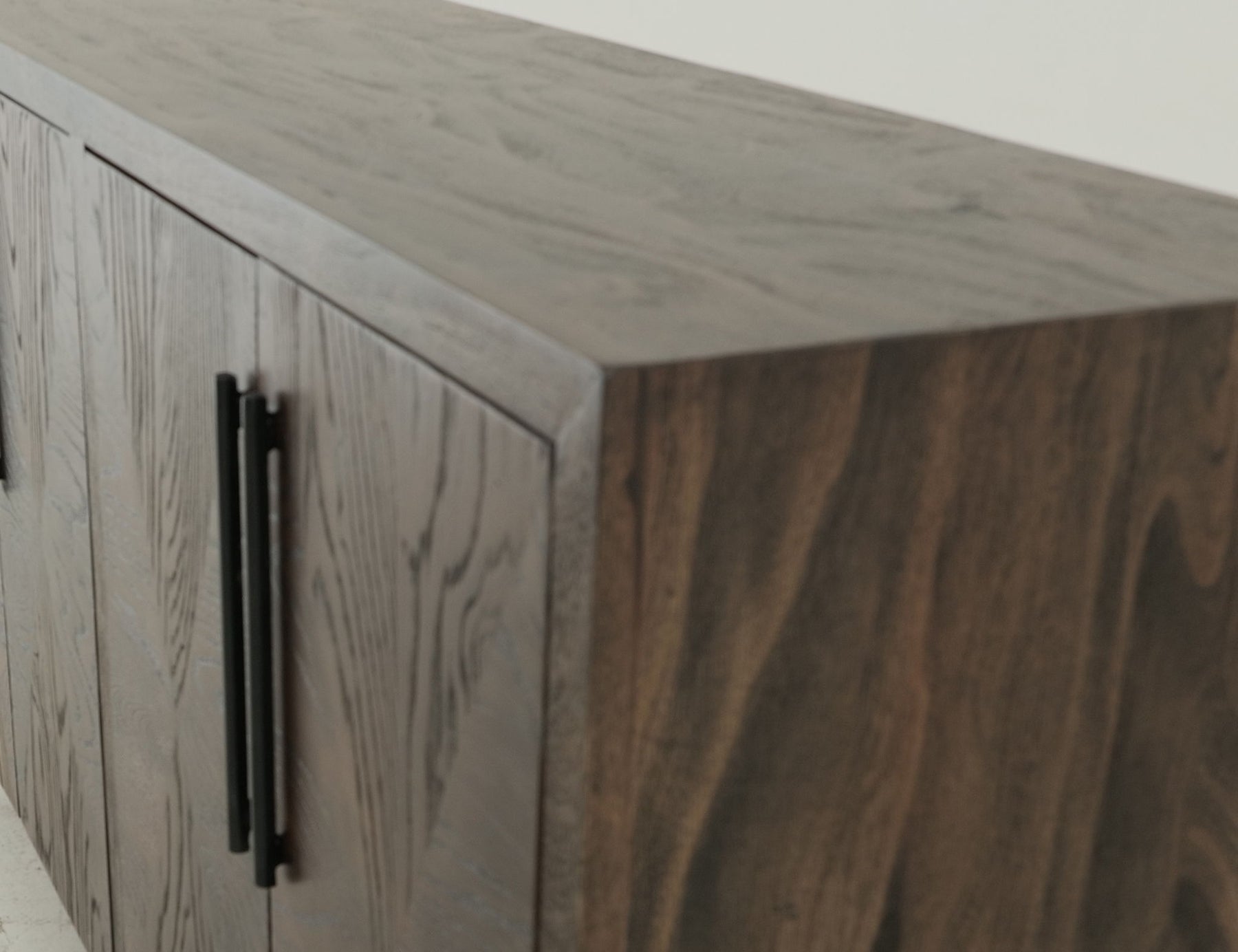 4 Door, Console. The Verona console combines sculptural elegance, making it a versatile addition to any space. Constructed with a solid mango wood frame and mortise-and-tenon joinery, it offers both strength and artisanal quality. The doors and top are made from engineered ash wood, featuring a bold geometric pattern that showcases the natural wood grain. In contrast, the slim metal base adds a contemporary touch. Custom metal pulls provide a subtle yet refined finishing detail. This console also features an innovative storage solution, complemented by four shelves designed for optimal organization and style.
