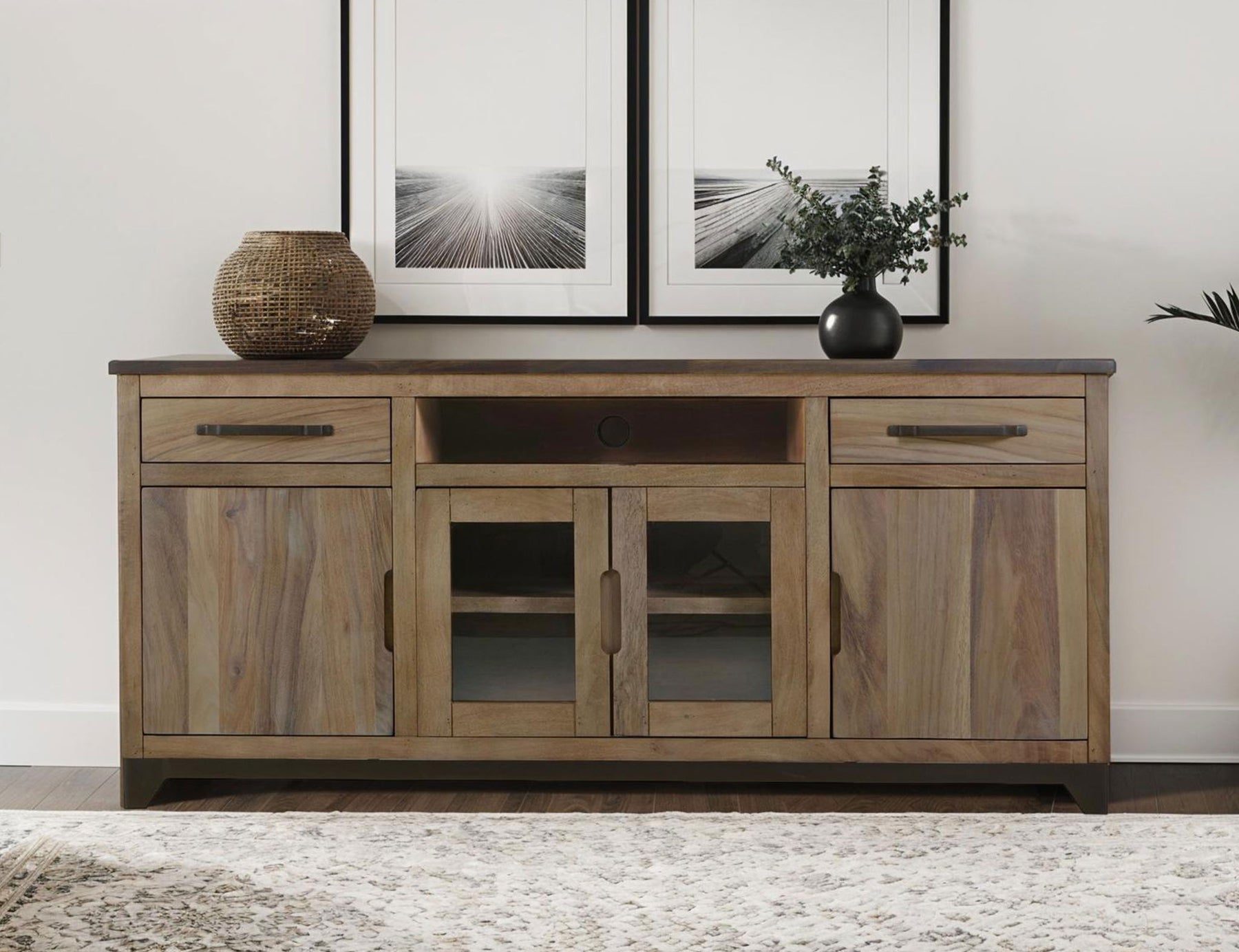 Soporte de 182 cm con 2 cajones, 2 puertas y 2 puertas de cristal. El soporte de parota natural es una elegante pieza de 182 cm que combina a la perfección diseño y robusta artesanía. Fabricado en madera de melina y mango, presenta un impresionante acabado marrón en la parte superior y un tono natural realzado por una laca translúcida de varios pasos que realza la veta natural de la madera. Este soporte cuenta con un estante central fijo, dos puertas de madera y dos puertas de cristal, todas con cierres magnéticos. Ofrece amplio espacio para sus dispositivos multimedia y artículos decorativos, lo que lo convierte en un complemento ideal para cualquier sala de estar o dormitorio. Además, incluye un sistema de gestión de cables integrado en el panel trasero para una apariencia limpia y organizada. La base de hierro, cortada y soldada a mano, está recubierta de pintura en polvo para una mayor durabilidad y protección contra la corrosión.