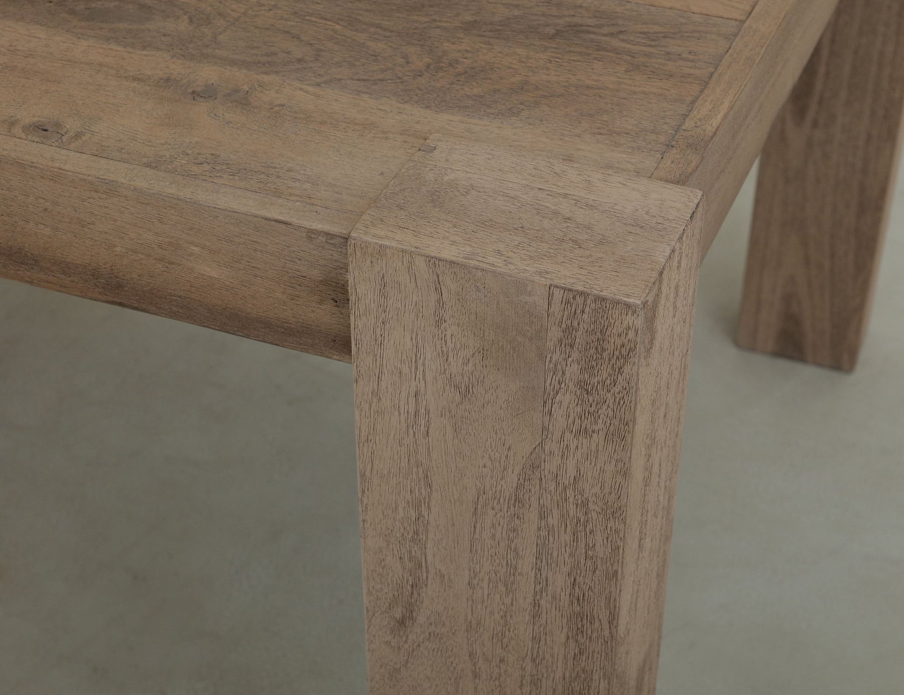 Mesa. La colección de comedor Luma presenta una forma rectangular con bordes limpios y rectos y una superficie lisa. Sus robustas y gruesas patas tienen un diseño rectangular que complementa a la perfección la estética general. Fabricada en madera de melina, presenta un cálido acabado marrón arena que le da un aspecto natural y rústico. La combinación de su sólida construcción y su elegante simplicidad la hace funcional y atractiva.