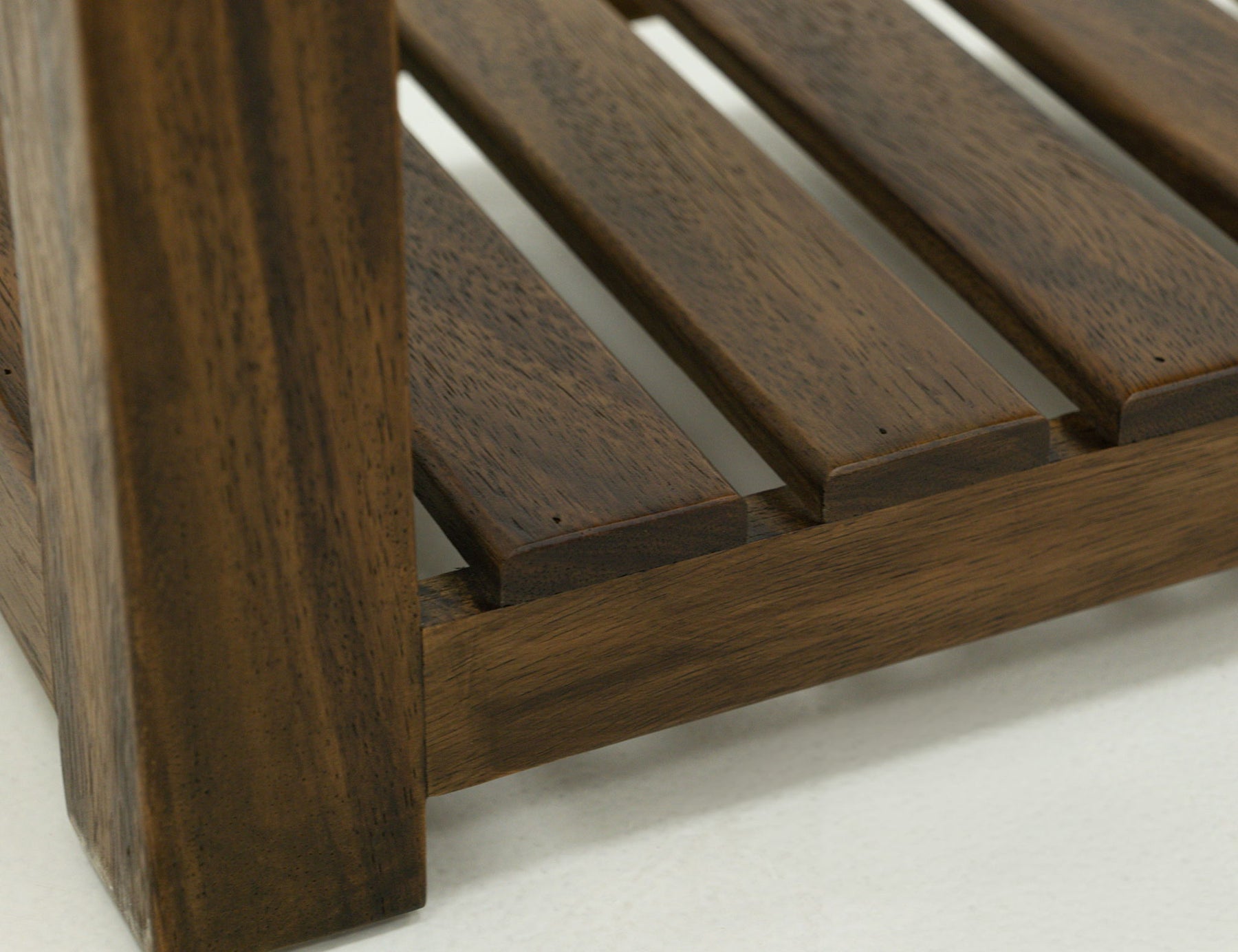Fabricadas en madera de parota con tableros de chapa de nogal. Estas mesas presentan un acabado lacado translúcido de varios pasos en un tono intenso que realza la belleza natural de la madera. Cuentan con tiradores personalizados y un estante inferior de listones para mayor espacio de almacenamiento, combinando practicidad y estilo. La mesa cuenta con ruedas para facilitar su transporte, lo que permite moverla sin esfuerzo.