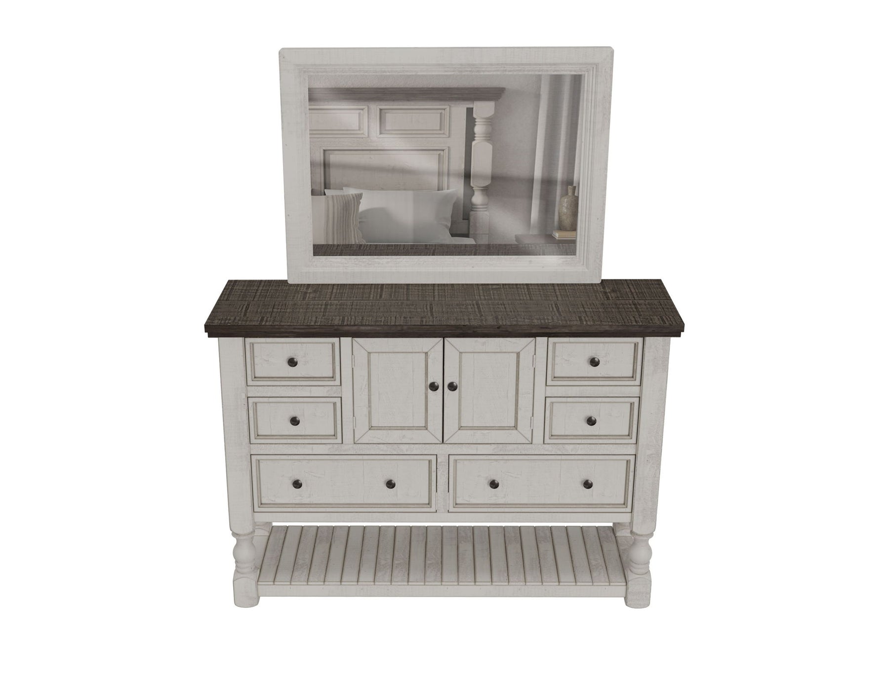 Espejo de dormitorio. Con un aire rústico y un toque de encanto clásico, la Colección Stone está elaborada meticulosamente con madera maciza de pino. La madera presenta un ligero efecto envejecido, con un acabado blanco, y se complementa con tableros desgastados.