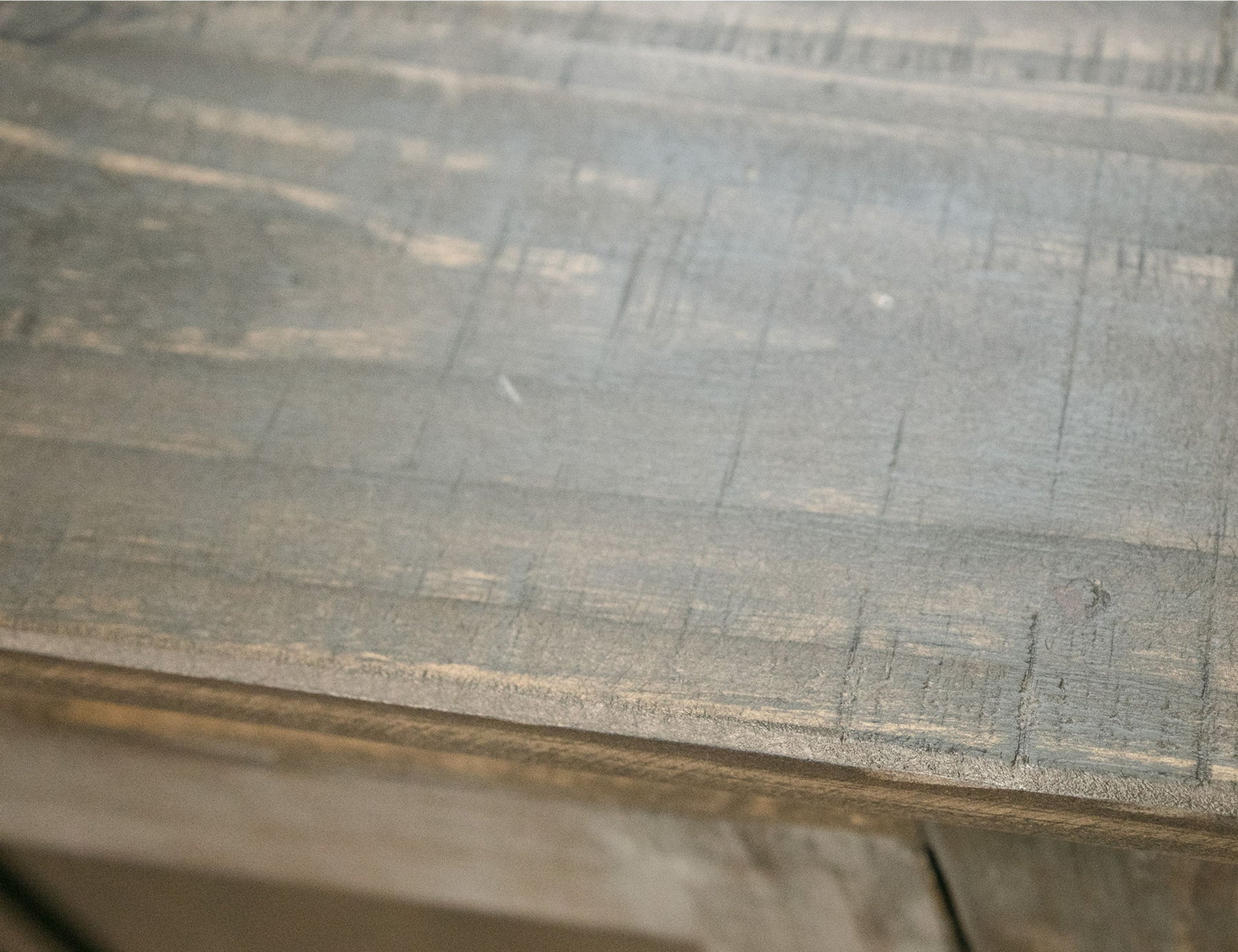 - Finition laquée acrylique à base d'eau, peinte à la main en plusieurs étapes, dans des tons gris et bruns pour un aspect « bois de récupération » modernisé.