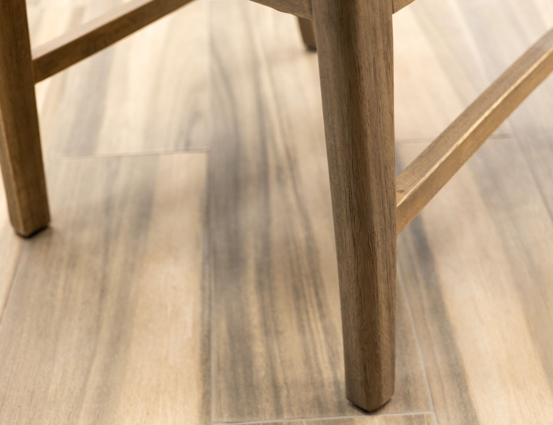Upholstered Chair. Elevate your space into a contemporary organic haven with the Xel Ha chair. Constructed from sustainable mango wood with a calming brown finish and featuring an upholstered faux leather seat, this minimalist collection stands out with its sleek lines and gentle, rounded edges.